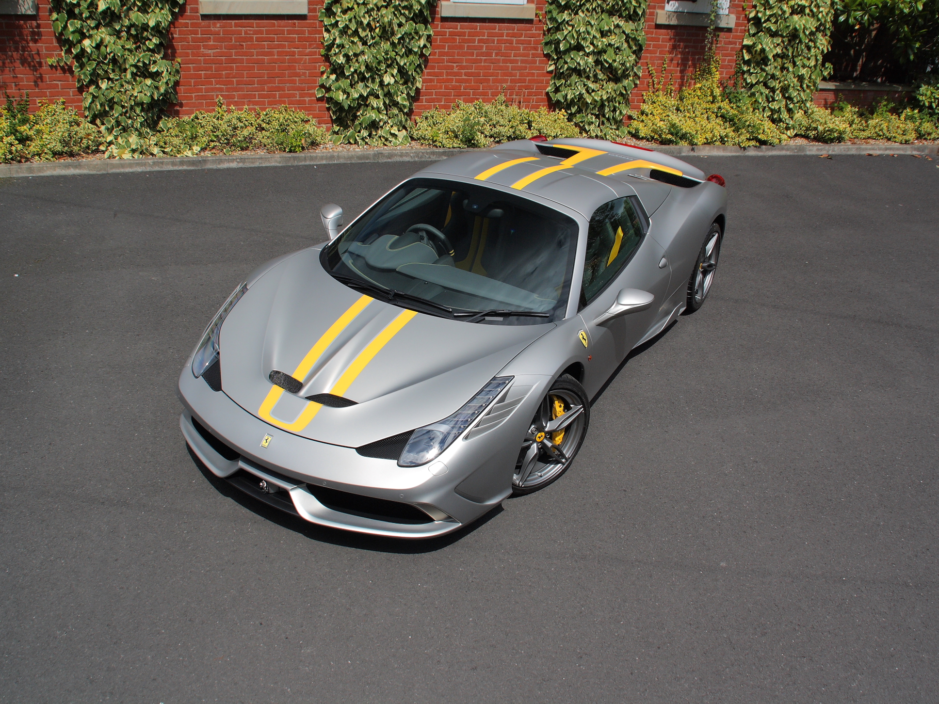 There are 499 Ferrari 458 Speciale Aperta's produced with just 40 UK models, which this example is one of. A one-owner car, this model is presented in the special order colour of Aluminio Opaco with Extracampionario Stripe and paired with the Charcoal Leather and yellow stripe interior it makes an incredible colour combination. The car comes with high specification including satellite navigation, Bluetooth, front and rear parking sensors with rear camera, Giallo fly brake callipers, carbon ceramic brakes, carbon fibre 'style' 3D racing seat, battery conditioner, Scuderia shields, titanium exhaust pipes, Giallo fly seat belts, yellow rev counter, AFS front lighting system, front suspension lift, outer and inner electrochromic mirrors, outer carbon fibre B-pillars, embroidered prancing horse on headrests, lower tunnel and headlining in leather, yellow contrast stitching, floor mats with embroidered logo, anti stone chipping protective film and a tracker.